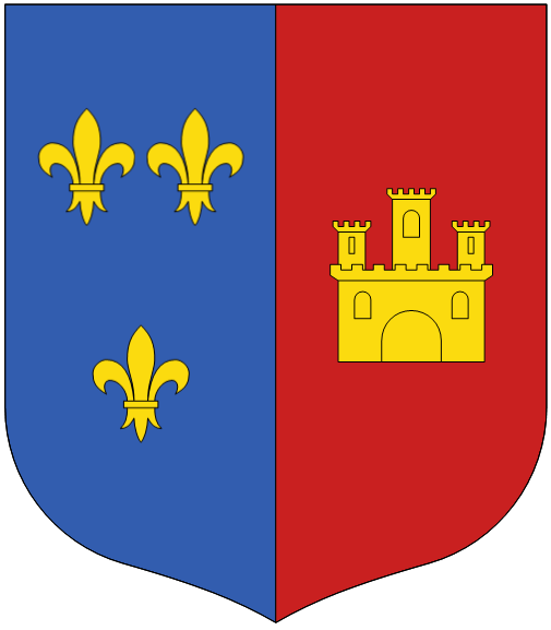 ❌ mi-parti d’azur à trois fleur-de-lis d’or et parti de gueules au château d’or
